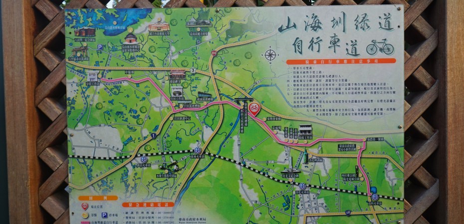 01山海圳綠道是一條大致以嘉南大圳為主線規劃而成的自行車道, 沿嘉南大圳防汛道路,銜接上游的烏山頭水庫與下游的臺江國家公園,形成一條長約45公里的自行車道,整合既有的資源及各個路段,整合美景風光,整合山、海、圳水,這條自行車有生態、歷史、人文、科學園區、老街道;有城市,有小聚落,有大馬路,亦有羊腸小徑。