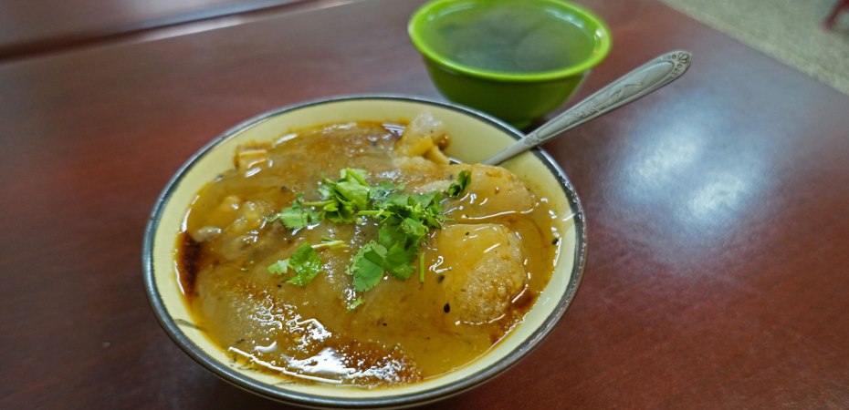 (東山肉圓)半透明肉圓皮裹豬肉與竹筍,皮稍微煎過咬起來Q勁十足,竹筍脆搭配醬料真是好吃,另有簡餐/便當/鍋燒意麵/陽春麵